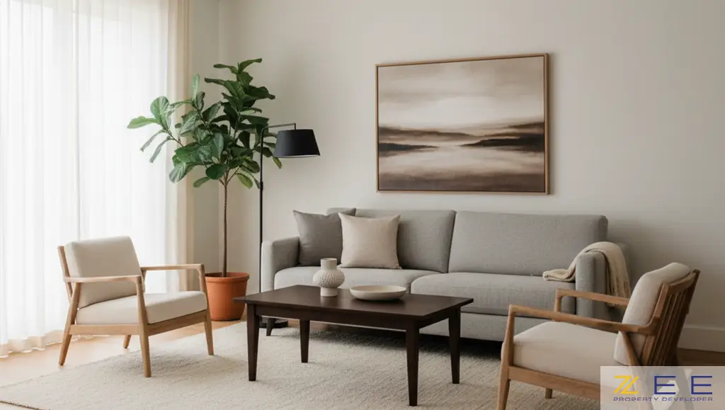 | اتاق نشیمن | مبل و میز جلومبلی | طول میز جلومبلی باید حدود دو-سوم طول مبل باشد. ارتفاع آن نیز باید برابر یا کمی پایینتر از نشیمن مبل باشد. | چیدمان هماهنگ مبل خاکستری با میز جلومبلی چوبی که قانون دو-سوم را در مقیاس رعایت کرده است. |